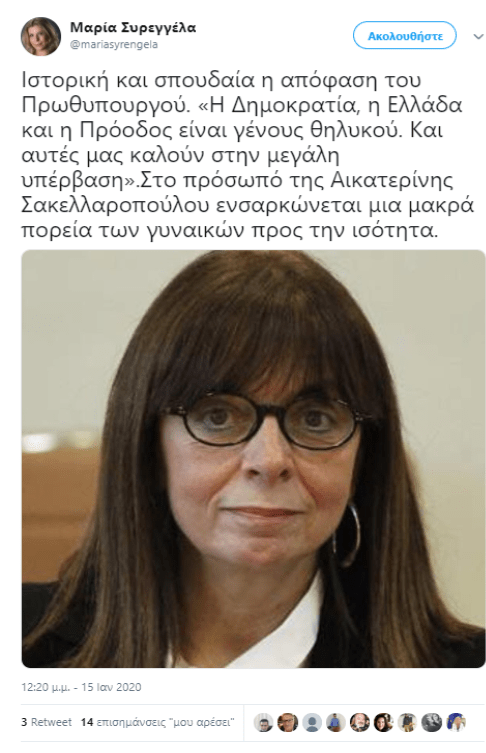 Με αφορμή την πρόταση του Πρωθυπουργού, Κ. Μητσοτάκη να εκλεγεί από την Βουλή για την θέση της Προέδρου της Δημοκρατίας η νυν Πρόεδρος του Συμβουλίου της Δημοκρατίας, κ. Αικ. Σακελλαροπούλου, η Γενική Γραμματέας Οικογενειακής Πολιτκής και Ισότητας Φύλων, Μ. Συρεγγέλα, έκανε σχόλιο στο προσωπικό λογαριασμό της στο twitter:
